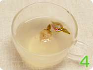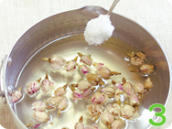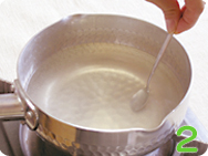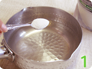 ![]() 1.鍋に500mlの水と3〜4g(小さじ約1杯半)の粉寒天を投入する。 |